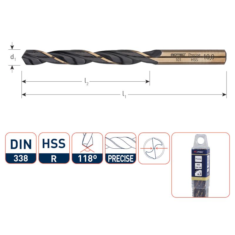 HSS-R Spiraalboor 'Precise', DIN 338, kort, tophoek 118°. Door speciale walstechnologie verkregen stabiele en verdunde kern in de boorpunt, worden de snijkrachten aanzienlijk gereduceerd. Dit zorgt voor een langere standtijd, betere centrering en nauwkeurige gaten. Powered by Werkö