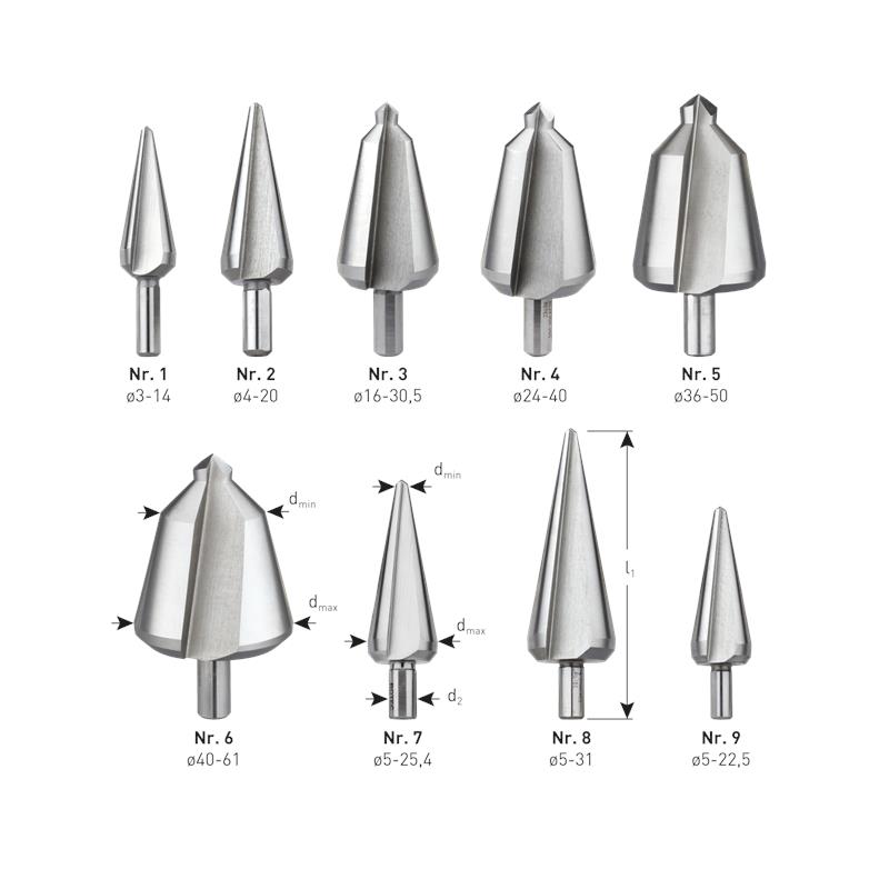 CBN-geslepen plaatboor uit massief HSS. De teruggeslepen conus zorgt ervoor dat bij het doorboren van het materiaal, de boor zonder moeite kan worden teruggetrokken.