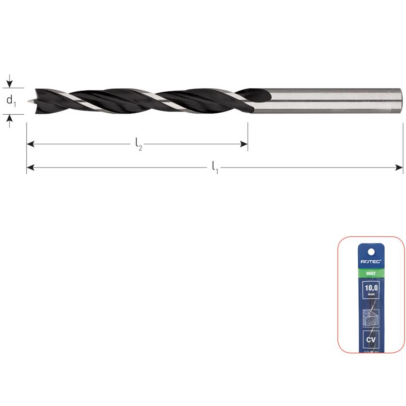 Machinale houtboor, vervaardigd van chroom-vanadiumstaal, voorzien van centreerpunt en twee voorsnijders.