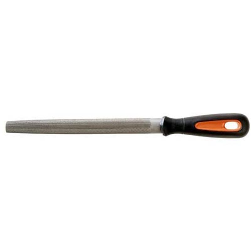 Chroom-Vanadiumstaal, naar de punt taps toelopend, hoge verspaningscapaciteit, dubbel gekapt. Voor het vijlen van holle en vlakke oppervlakken en grote gaten, geschikt voor ontbramen. greep van harde polypropyleenkern, bekleed met rubber, biedt een comfortabele antislip grip.
