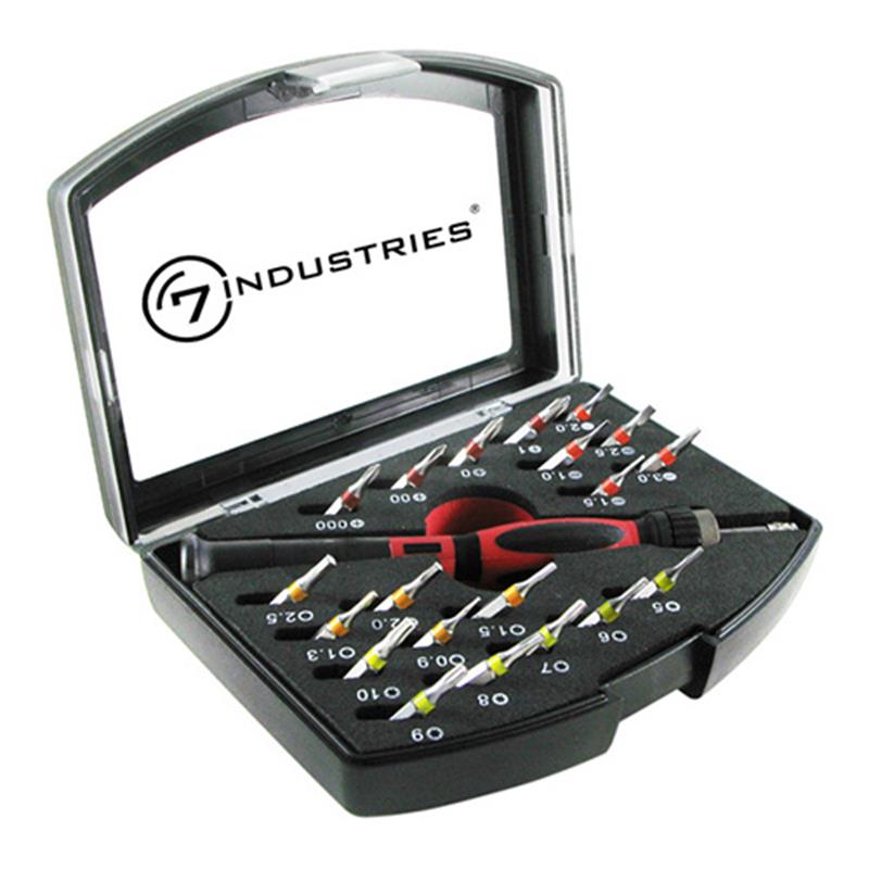 Bevat 20 precisie bits met kleurcode en een ESD houder/ handvat 130 mmmet omschakelbare ratelfunctie. Bits PH000-00-0-1. SL1-1,5-2-2,5-3 mm. HEX0,9-1,3-1,5-2-2,5. TX3-4-5-6-7-8. In kunststof bewaar cassette met ophang clip en broekriemclip.