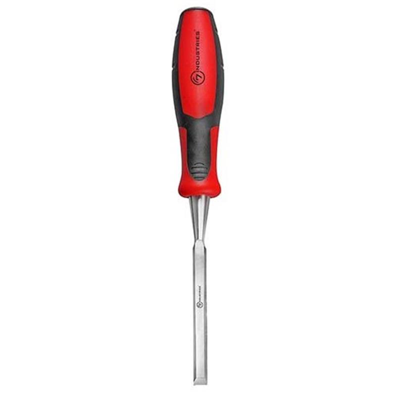 Met 2-componentengreep en slagkap, waardoor er met een slagvoorwerp (bij voor- keur rubberhamer) extra kracht kan worden gezet op het werkstuk. Beitel van Chroom-Vanadiumstaal.