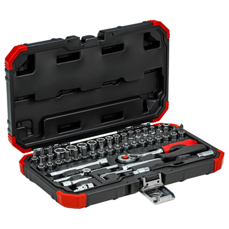 - Omschakelbare ratel 1/4”: met 2C-greep, rechts-/linksomdraaiend omschakelbaar door pal, drukknop-ontkoppeling, fijnvertand, ovale kop, 2-componenten-greep, handsparende krachtoverbrenging, voor dopsleutels