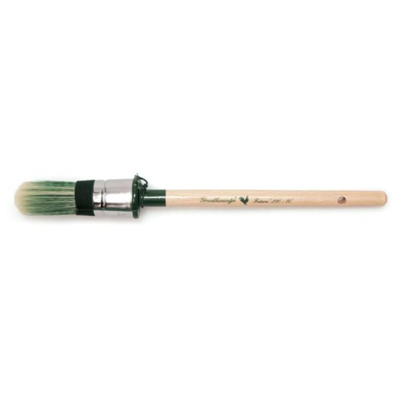 Patentpuntkwast, houten gelakte steel met groene broek, inox bus, gemodificeerde polyester vezels, opgebonden met verlijmde touwwoeling.