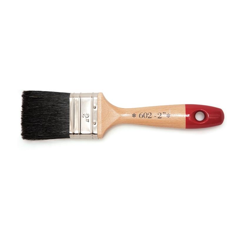 Platte kwast, dubbeldik, houten gelakte steel met rode punt, vernikkelde bus, zuiver natuur zwart Chinees varkenshaar Chungking 60/70% tops.