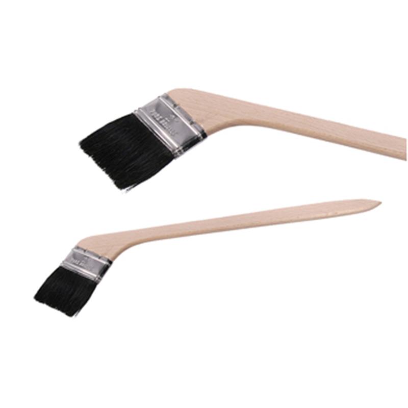 Afgebogen model radiatorkwast met zwart varkenshaar. Met ongelakte houten steel.