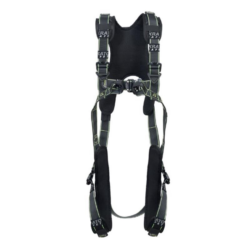 Het veiligheidsharnas Fly'in 1 FA1010100 van Kratos heeft 1 ankerpunt voor valbescherming aan de rugzijde (1 dorsale stalen D-ring) en 1 ankerpunt voor valbescherming aan de borstzijde (1 sternale D-ring); uitgevoerd in 2 webbing lussen. Door de gemaasde versteviging aan de rug, schouder en beenbanden heeft dit harnas een hoog draagcomfort en betere schokabsorptie bij een val.